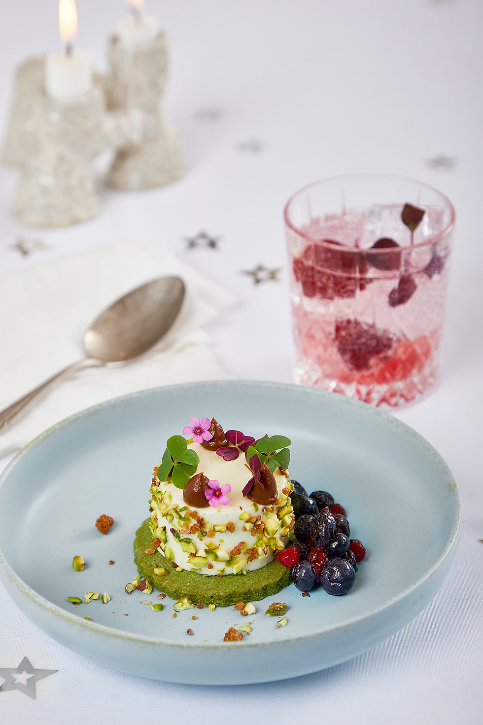 Pistaciekiks – passionsfrugt – syltede bær – saltet karamel – crumble - skovsyre